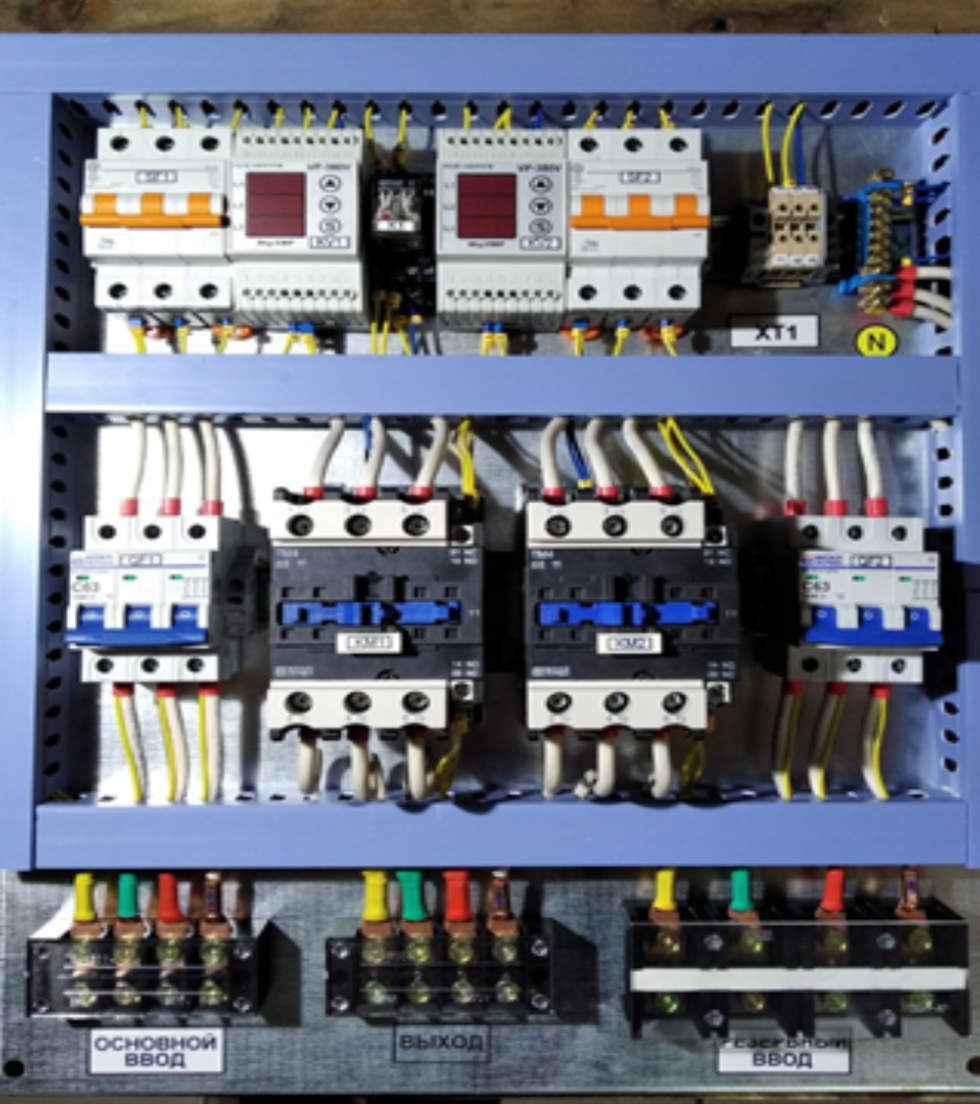 Збирається на контакторній схемі з пріоритетом на перший ввід. Використовуються два контактори по необхідний потужності з механічним блокуванням. В АВР використовується два реле контролю фаз з лінії та генератора з розширеними налаштуваннями.